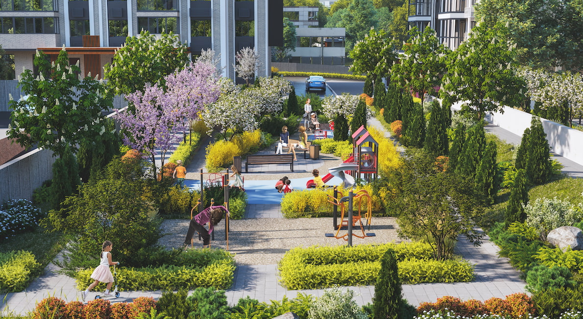 Для відчуття повної гармонії з природою на території комплексу передбачили зелені алеї з авторським ландшафтним дизайном та зонами відпочинку. Тут можна на повну насолодитися затишком, відпочити та відновити сили.