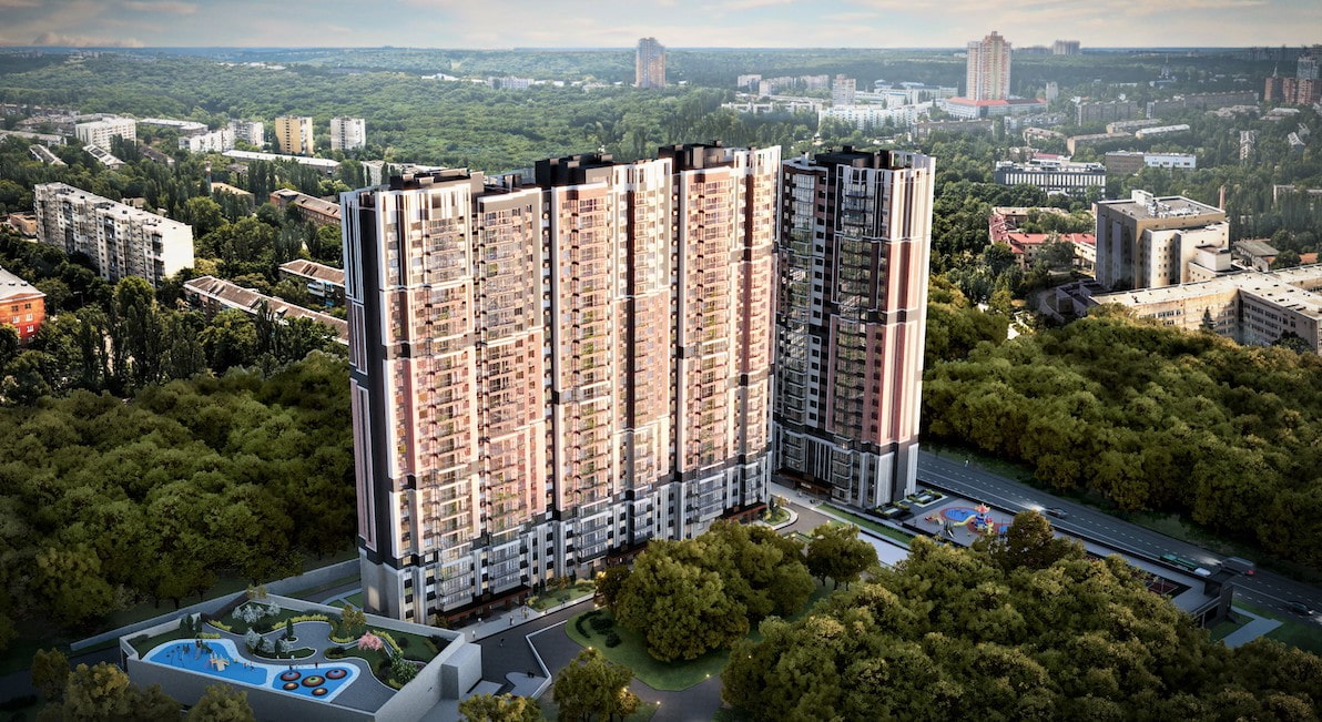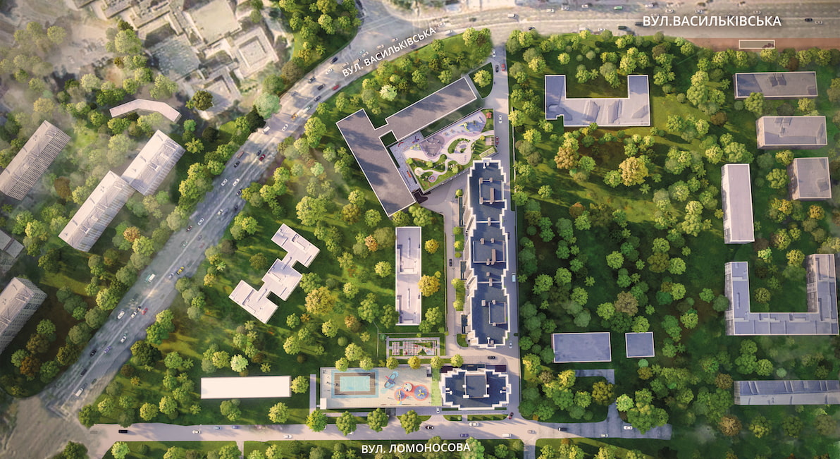 Комплекс розташований в серці незеленішого району, де свіже повітря, зелені насадження та один з найбільших парків міста по сусідству стають щоденною реальністю.Справжнє багатство міста – неймовірні дерева,тінисті алеї, ставки.