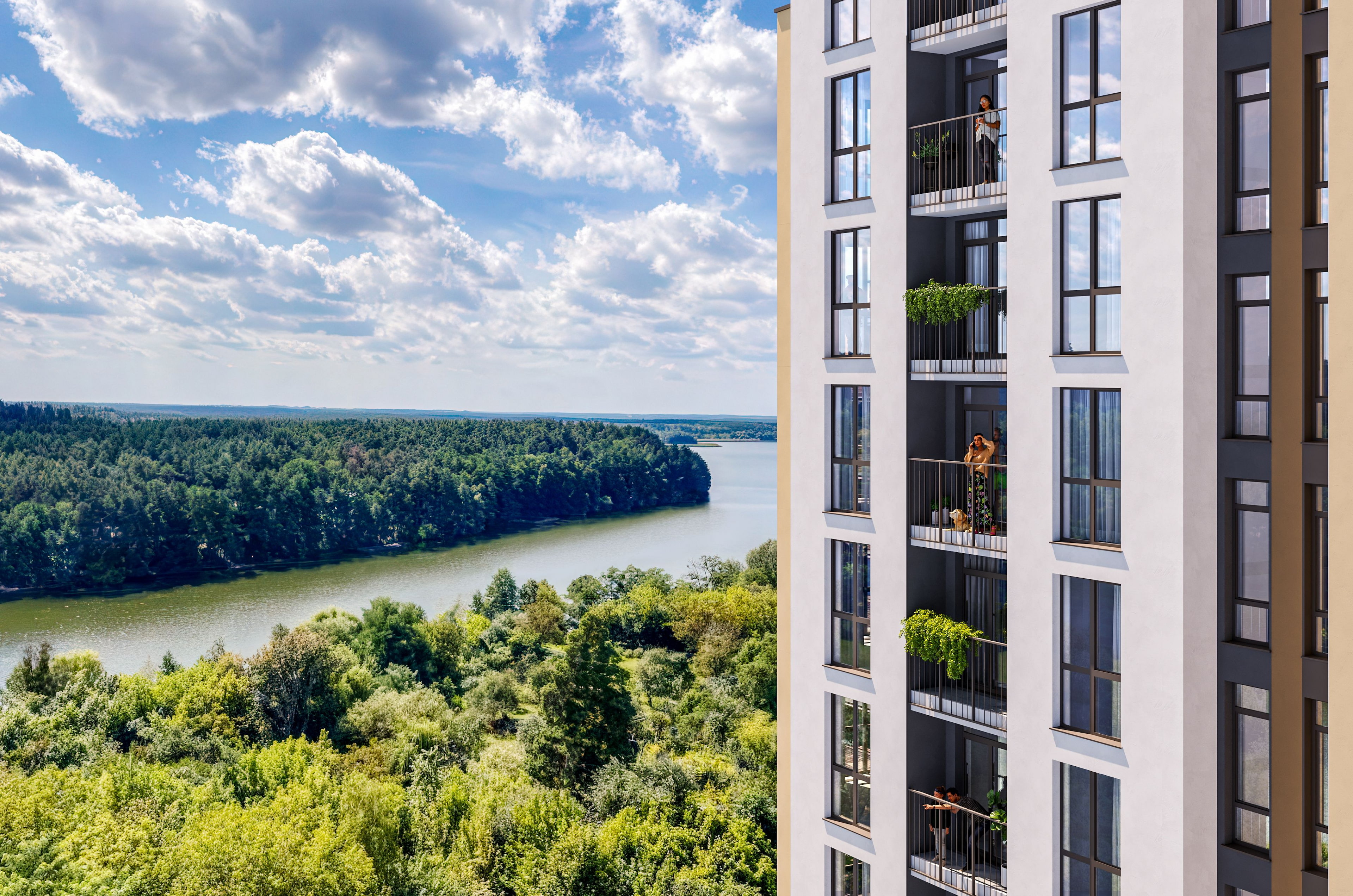 Цікавий фасад з багаторівневою конструкцією та яскравими елементами, а також панорамні вікна з виглядом на річку, лісопаркову зону чи захід сонця.